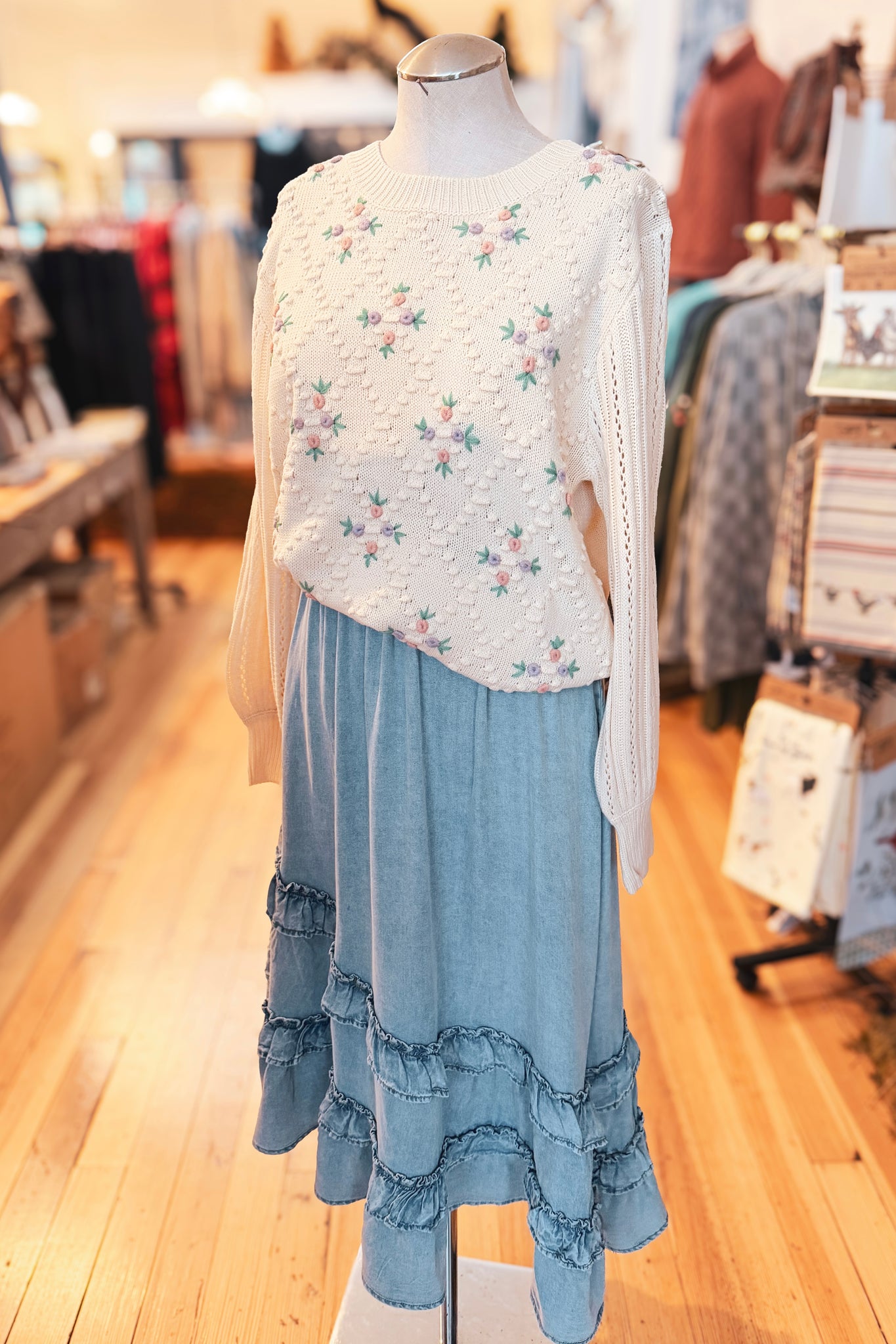 Flowy, flattering, and full of movement — the Blue Ridge Ruffle Midi Skirt is an effortless staple with just the right amount of bohemian flair. Designed with a soft asymmetrical silhouette, this skirt features cascading ruffle detailing that creates beautiful dimension and movement with every step.