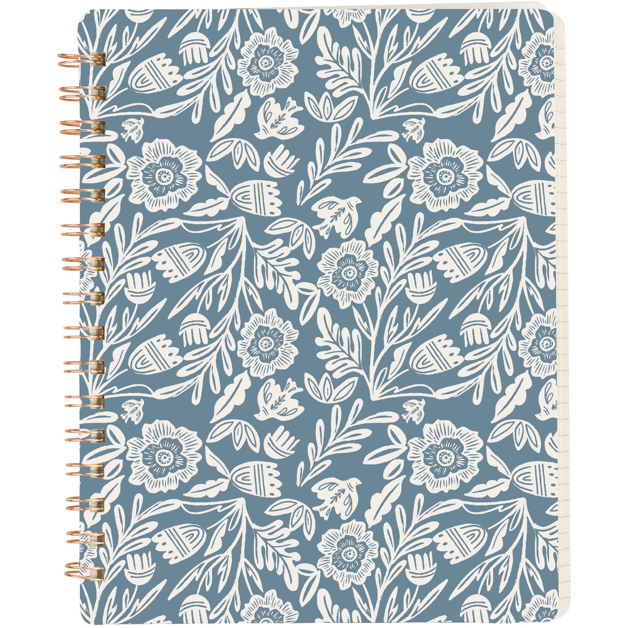 A double-sided spiral notebook from our Folk Art Collection displaying a calming hand illustrated pattern of blue florals inspired by Scandinavian folk art. Back cover features coordinating blue floral pattern. Our Blue Folk Floral spiral notebook includes 120 lined pages. An inspirational everyday accessory that is also great for gifting.