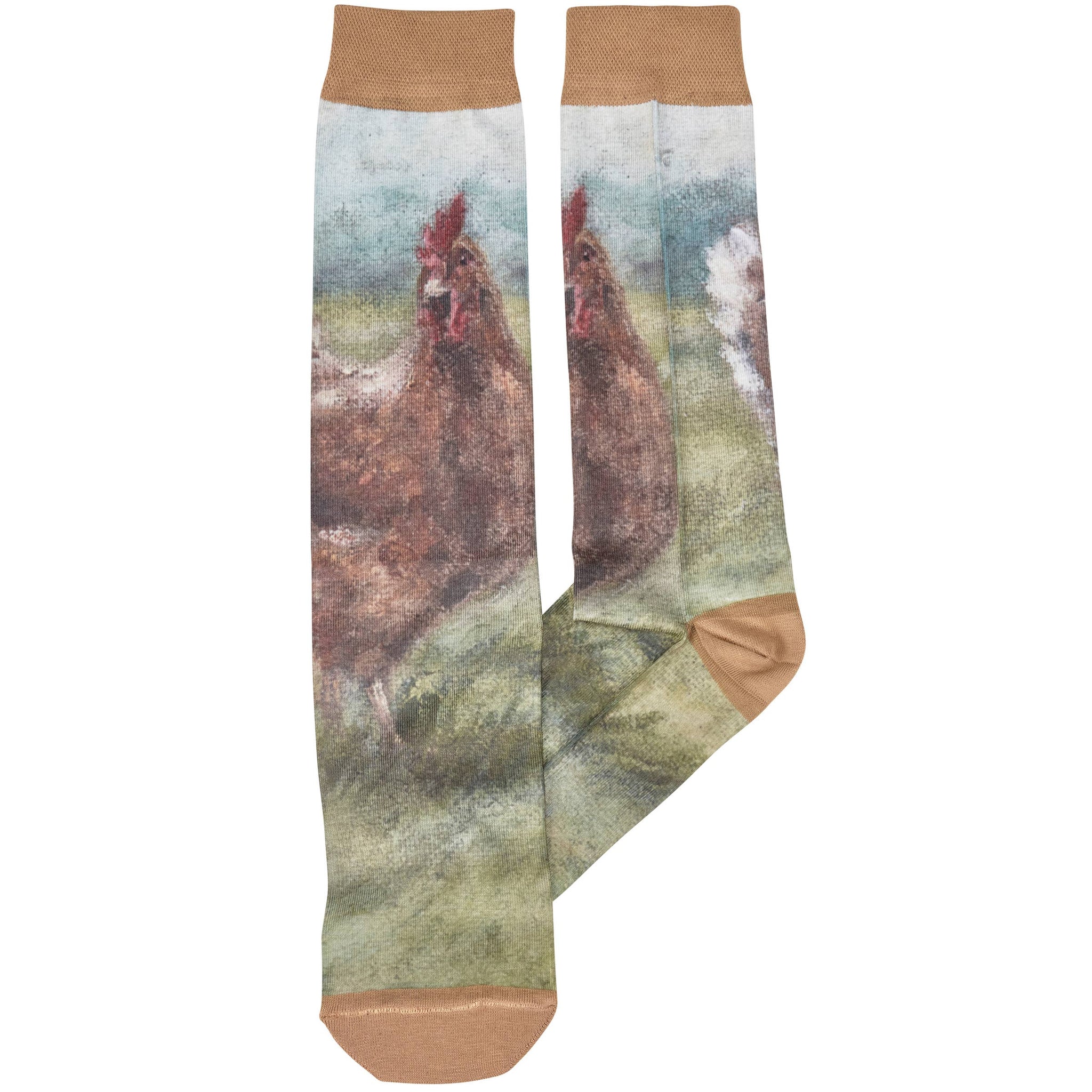 A pair of colorful knee-hi socks from our Farmhouse Collection displaying a hand painted design of a farm chicken on each sock. Design is digitally printed and replicated from original artwork painted onto burlap canvas, giving the art a unique depth and texture. Socks feature a knee-high length to easily show off the full design. Our knee-high Chicken socks come with a header card and a clear plastic hanger for display. A charming farm-themed gift perfect for everyday self-expression.