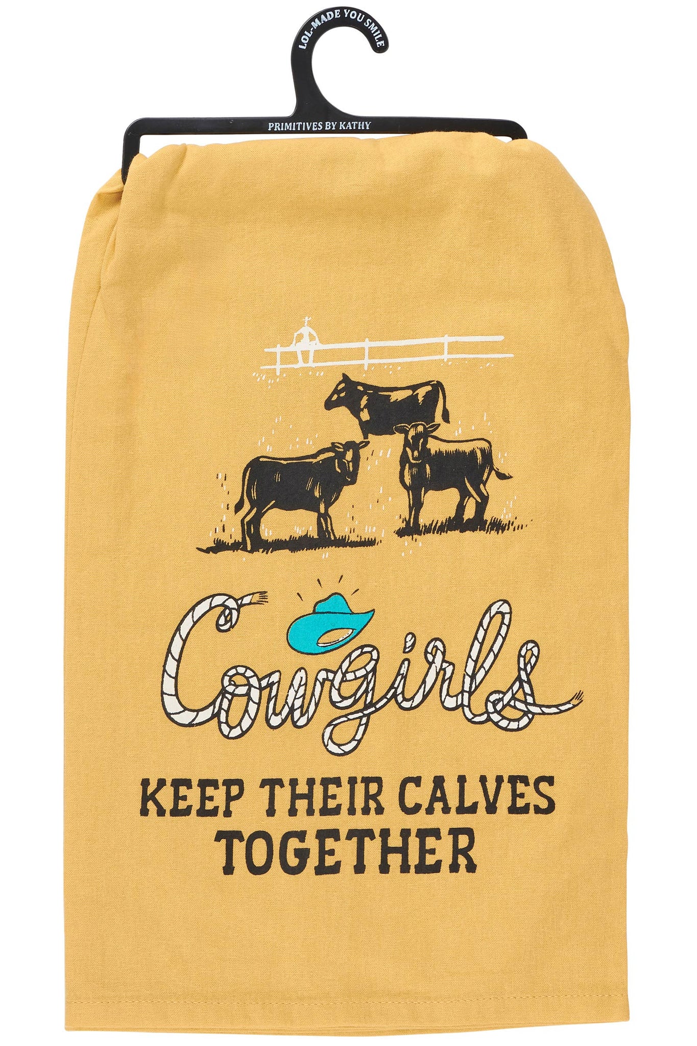 A golden yellow cotton kitchen towel from our Western Collection displaying a western inspired design in a modern style with fun hand illustrated details and a sentiment that reads "Cowgirls Keep Their Calves Together." Our Cowgirls kitchen towel is conveniently machine-washable for easy cleaning.
