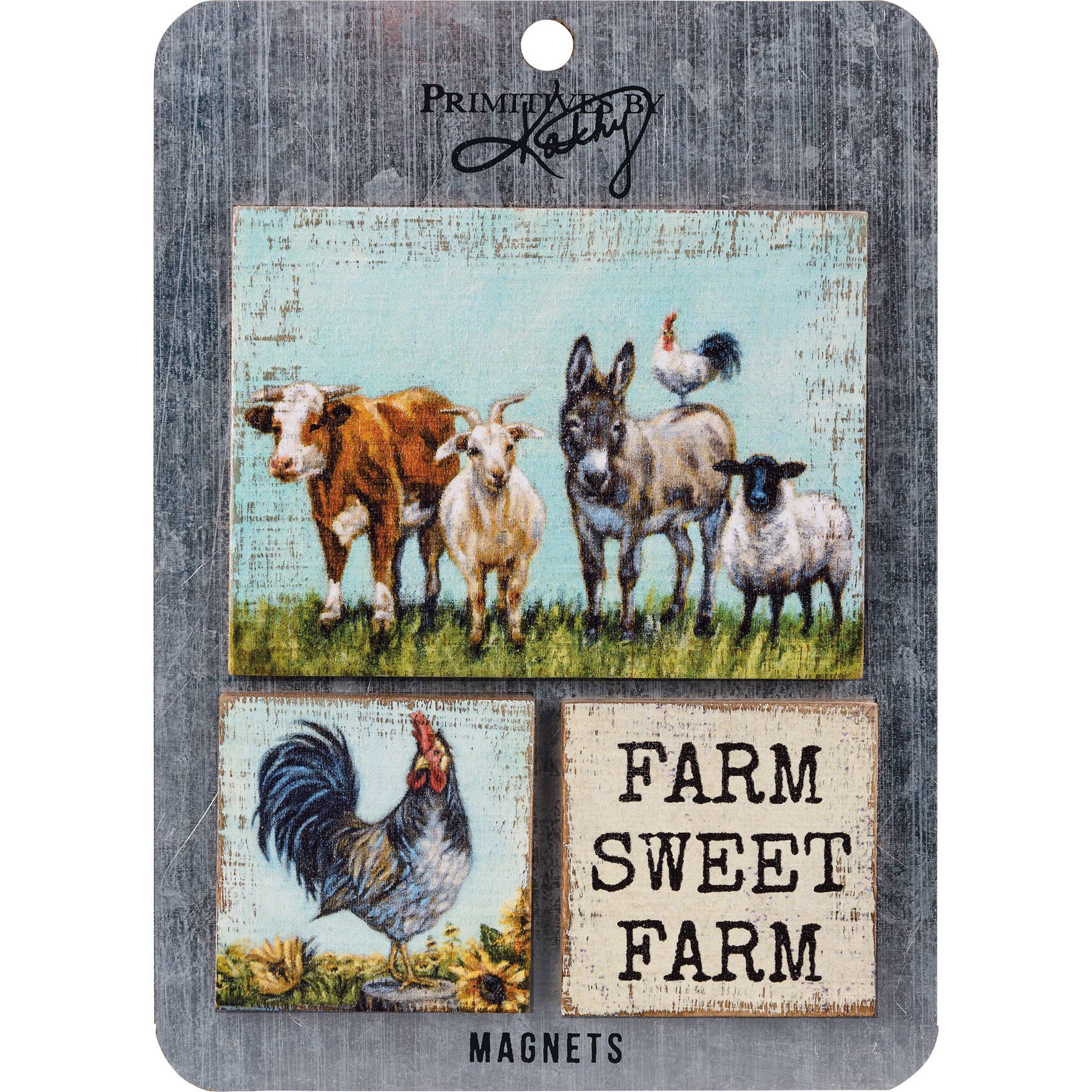 A set of three square magnets featuring a painted chicken design, various painted farm animals design, and one with "Farm Sweet Farm" sentiment. Painted animal designs are replicated from original artwork painted onto burlap canvas, giving the art a unique depth and texture. Magnets feature natural wood stained sides. Our Farm Sweet Farm magnet set is packaged on a galvanized metal backer card with a cutout to easily hang on rack.