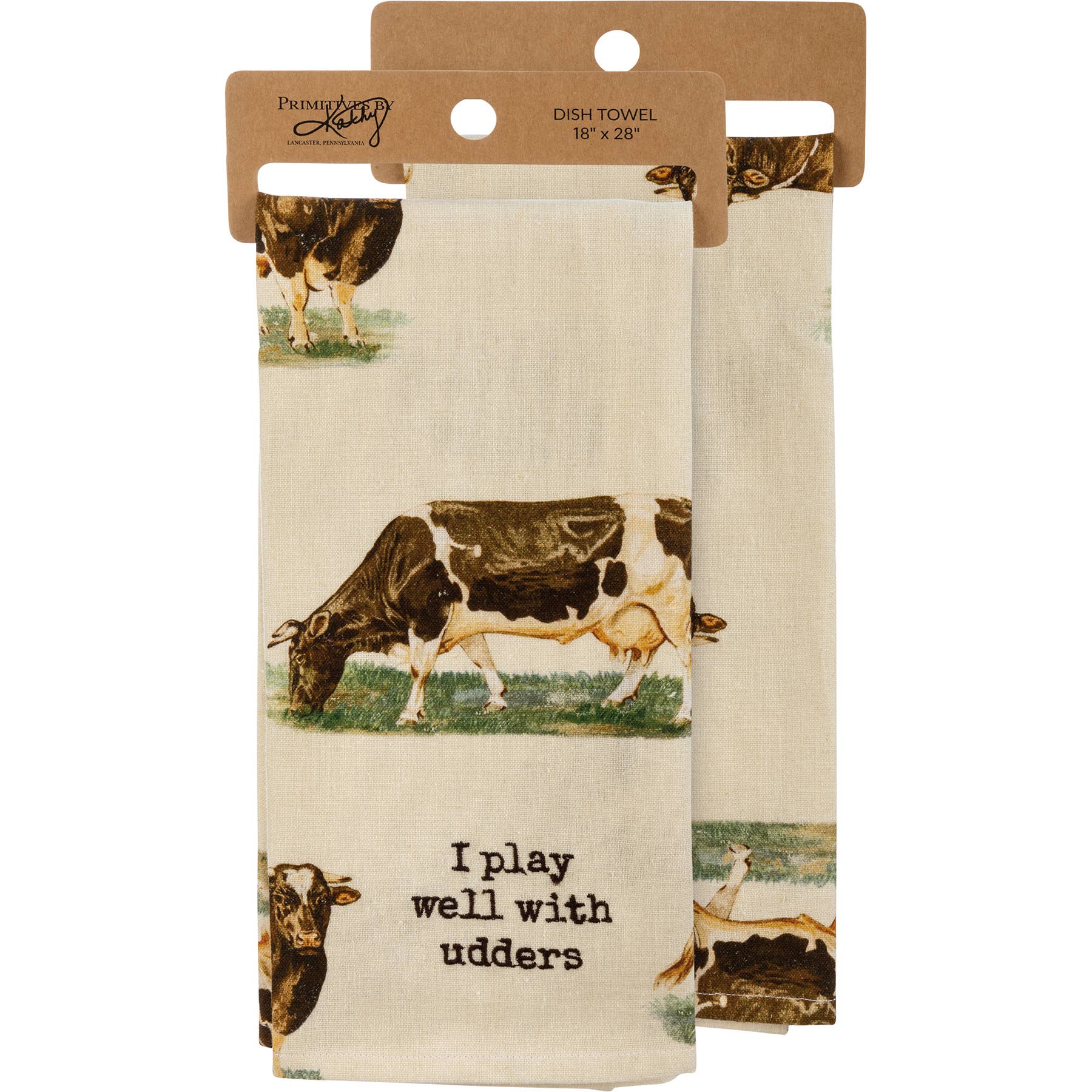 A cotton linen blend kitchen towel from our Farmhouse Collection featuring all-over vintage-inspired cow designs and punny embroidered "I Play Well With Udders" sentiment. Features a cotton tape loop in the corner for easy hanging. Machine-washable. Our I Play Well With Udders kitchen towel is packaged on a cardboard hanger with a hole to easily hang on rack.