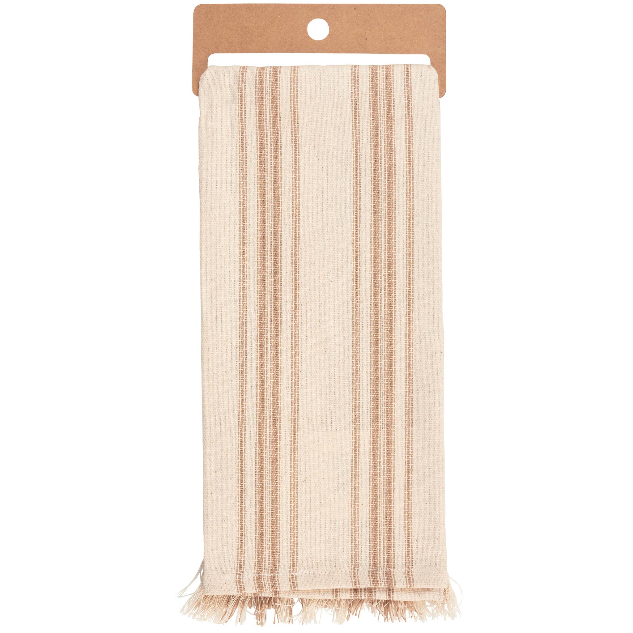 A cream cotton kitchen towel from our Farmhouse Collection featuring a stitched art panel with frayed border and woven brown stripes throughout. Design displays a kune kune pig in a field replicated from original artwork painted onto burlap canvas, giving the art a unique depth and texture. Our Kune Kune Pig kitchen towel is machine-washable for convenient cleaning. Packaged on a cardboard hanger with hole to easily display on rack. A rustic kitchen accessory perfect for everyday use.