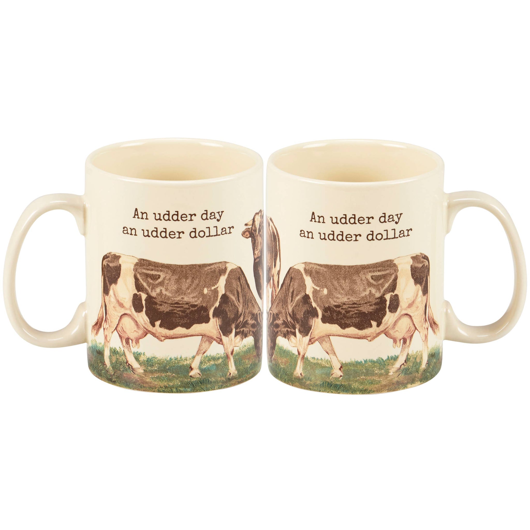 A stoneware 20 oz mug from our Farmhouse Collection displaying a double-sided design of cows in a vintage style. Design also features a fun farm animal-themed pun that reads "An Udder Day An Udder Dollar." Our Udder Day mug is microwave, oven, dishwasher, and food safe for convenient use. A fun farm-themed gift perfect for everyday drinkware.