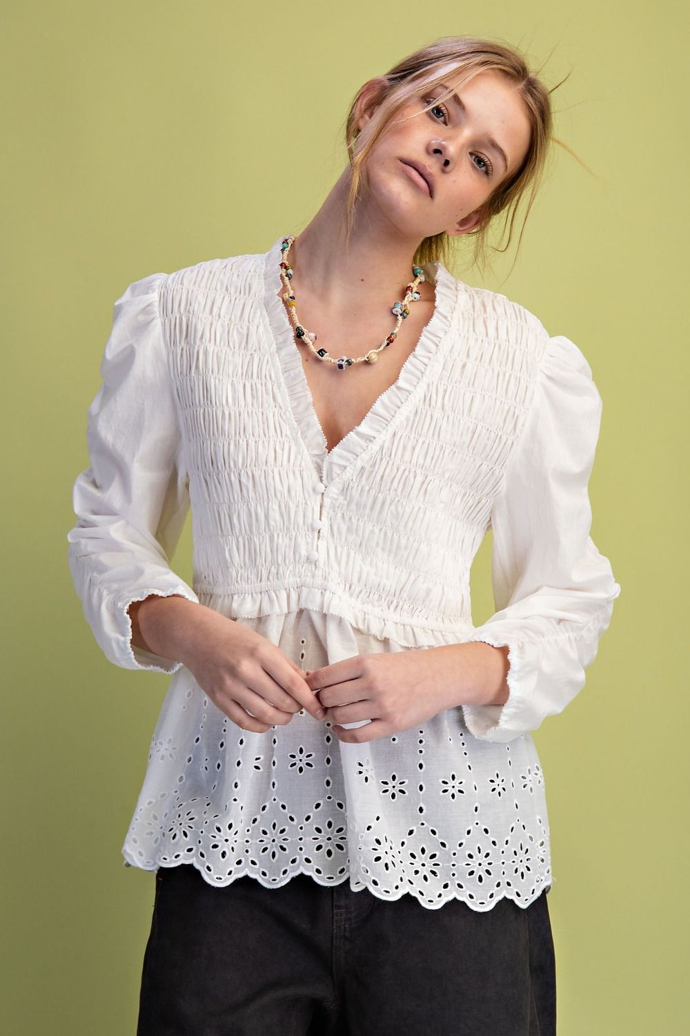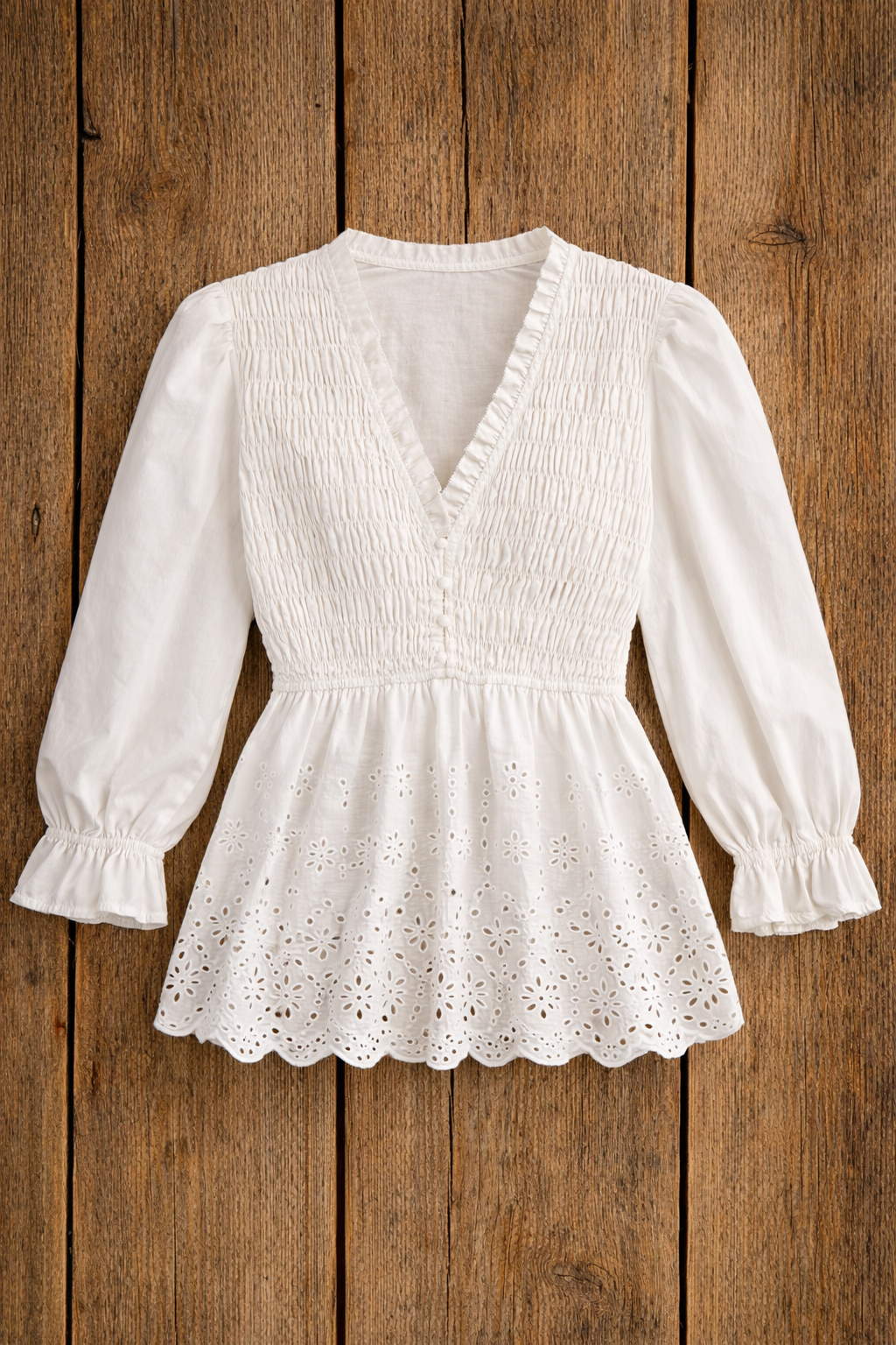 The V-neckline with button accents adds a vintage-inspired touch, while intricate eyelet embroidery and a scalloped hem bring soft texture and charm. It’s the kind of blouse that pairs perfectly with your favorite denim and boots for an easy, feminine look that works from day to night.