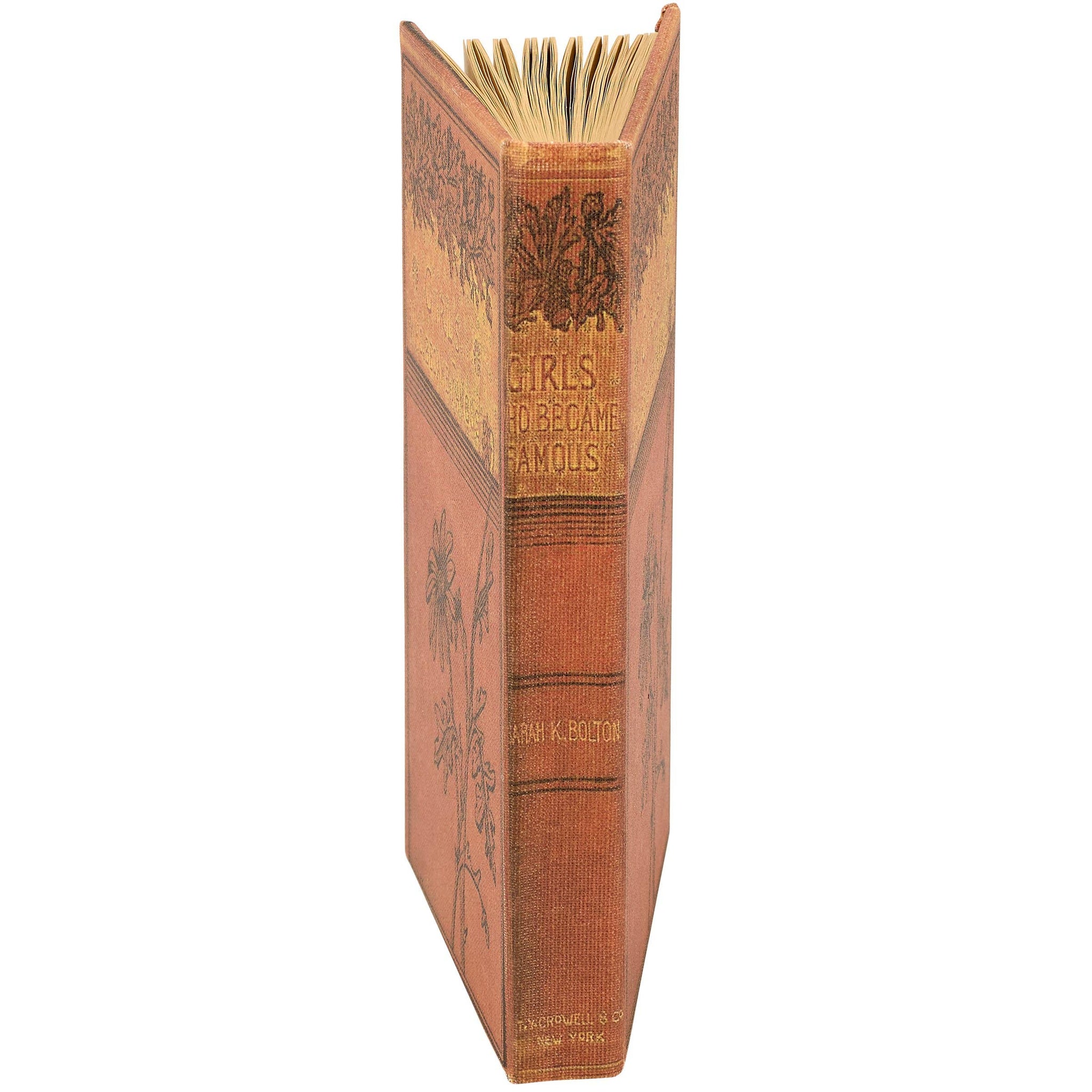 A high-quality decorative journal from our Dark Academia Collection displaying a vintage book inspired double-sided design. Vintage book design features a textured linen wrap with illustrated florals and book title that reads "Girls Who Became Famous." Journal spine also displays a coordinating design with book title and author to give the appearance of a book when on a shelf. Our Famous Girls journal includes 170 lined pages on vintage style paper to complete the aged appearance. A vintage book-themed gift perfect for any home office or desk.