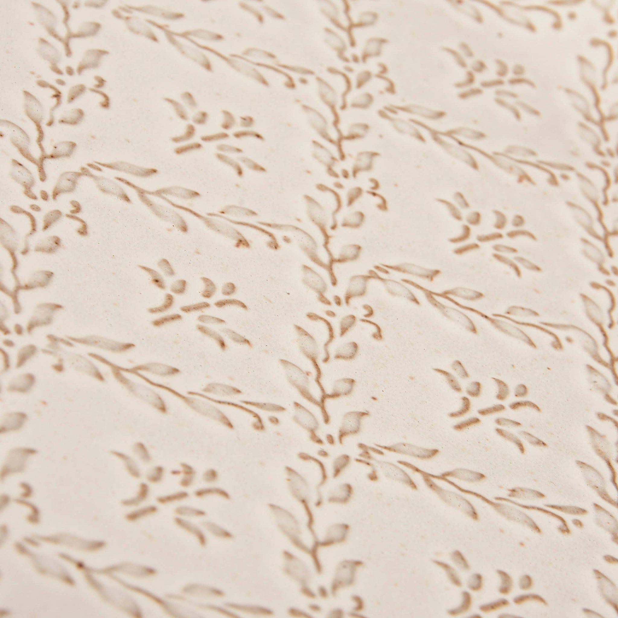 A durable dessert plate from our Cottagecore Collection displaying a cream glaze finish with embossed patterns of plant vines on the inside of the plate. Embossed vine designs come through the glaze for textured detail. Our Cottage Vine dessert plate features a neutral color palette to easily coordinate with a variety of table décor. Hand wash only. An elegant piece of tableware perfect for everyday gatherings.