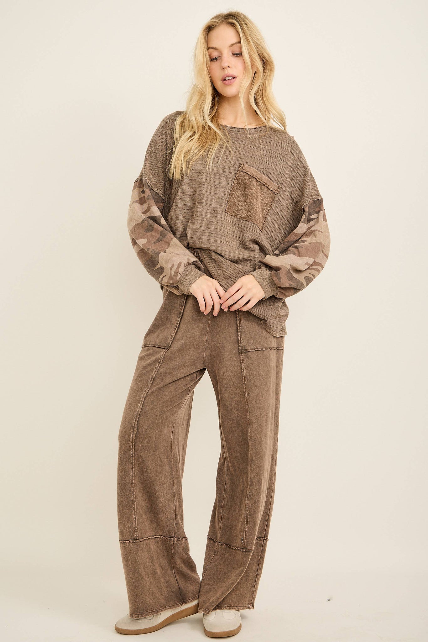Meet the kind of pullover you’ll reach for again and again — soft, lived-in, and just a little edgy. Our Chocolate Mineral Wash Camo Pullover blends a rich, earthy brown mineral wash with subtle camo detailing, giving you that perfectly broken-in look without sacrificing style.