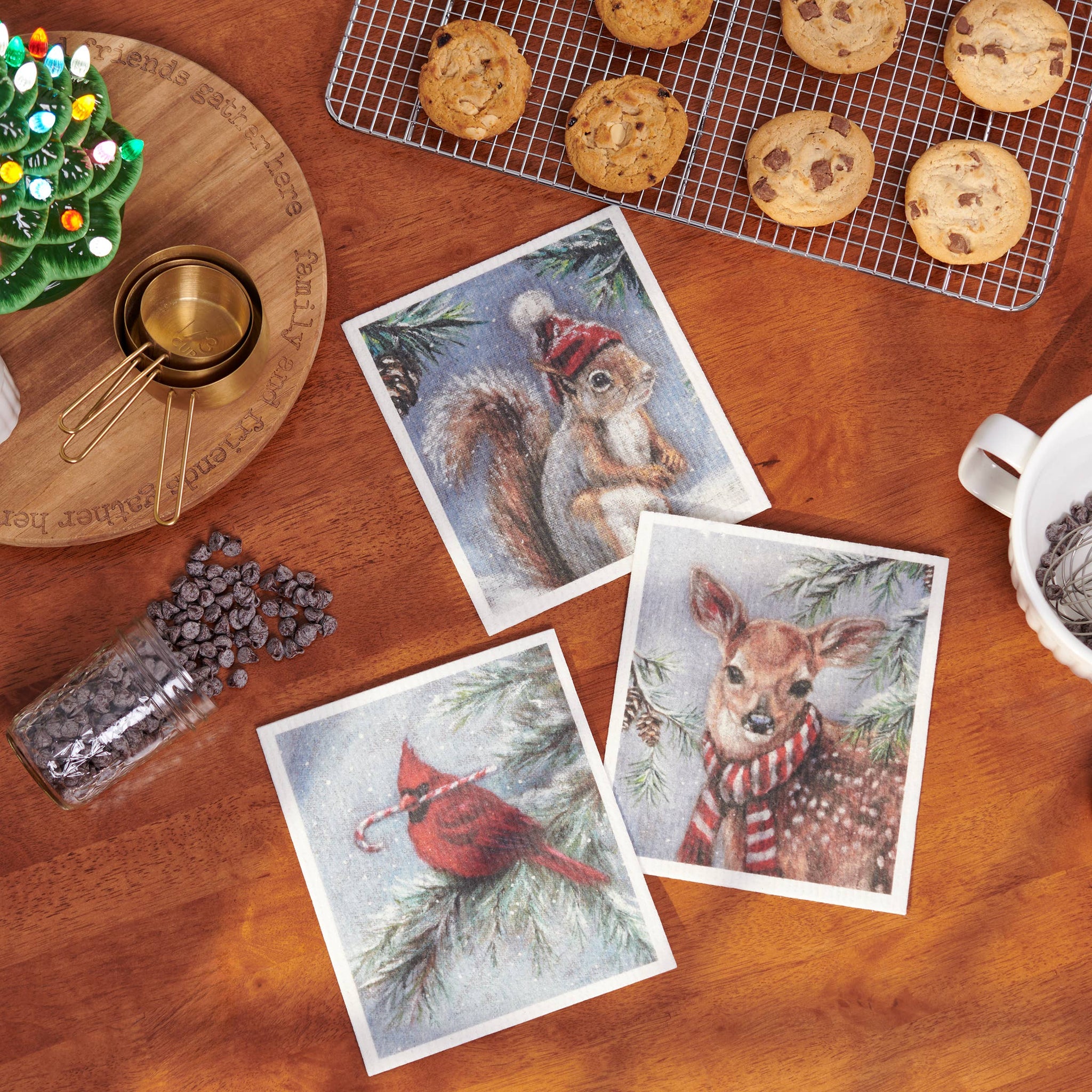 Safe to use on all types of surfaces, eco-friendly Swedish Dishcloths dry quickly and are antibacterial for more hygienic cleaning with reduced waste. This set of three Swedish Dishcloths from our Christmas Collection features comforting winter scenes of woodland animals wearing winter accessories. Designs are replicated from original artwork painted onto burlap canvas, giving the art a unique depth and texture. Our Winter Animals Swedish Dishcloth set is conveniently machine-washable for easy cleaning. Seasonal dishcloths are attached to header card with hole for easy rack display. A rustic set of winter-themed reusable dishcloths perfect for replacing dull sponges and paper towels with long-lasting colorful designs.