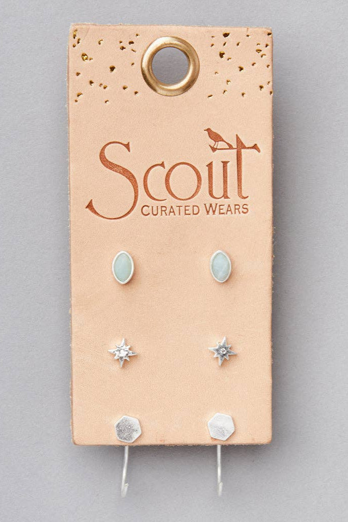 This trio of stud earrings features three distinct designs crafted from brass and semi-precious stones. Free from nickel and cadmium, these hypoallergenic studs are gentle on sensitive skin. Presented on a genuine leather card with elegant gold foil, each stone, including Amazonite—the Stone of Courage—adds a meaningful touch to your collection.