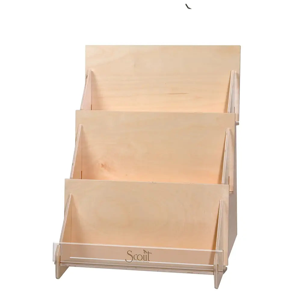 Three shelf step design, ships flat with easy assembly. Made out of natural wood panels with a clear acrylic Scout logo. Can hold up to 9 SKUs 3 each of the Jewelry Dish (JD) collection.